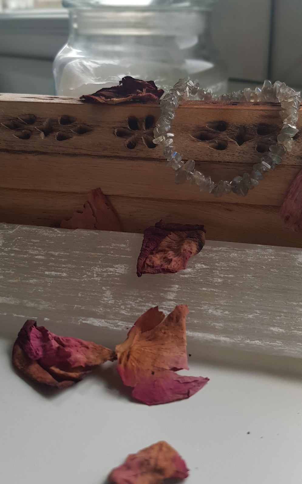 Labradorite is a dark stone. However very striking. Especially when the light catches it. It is very spiritual and strengthens intuition and psychic abilities. It aids spiritual developement and has been known to bring on past life recall during meditations. It assists in reducing impulsive behaviors and detoxifies the effects of addiction.