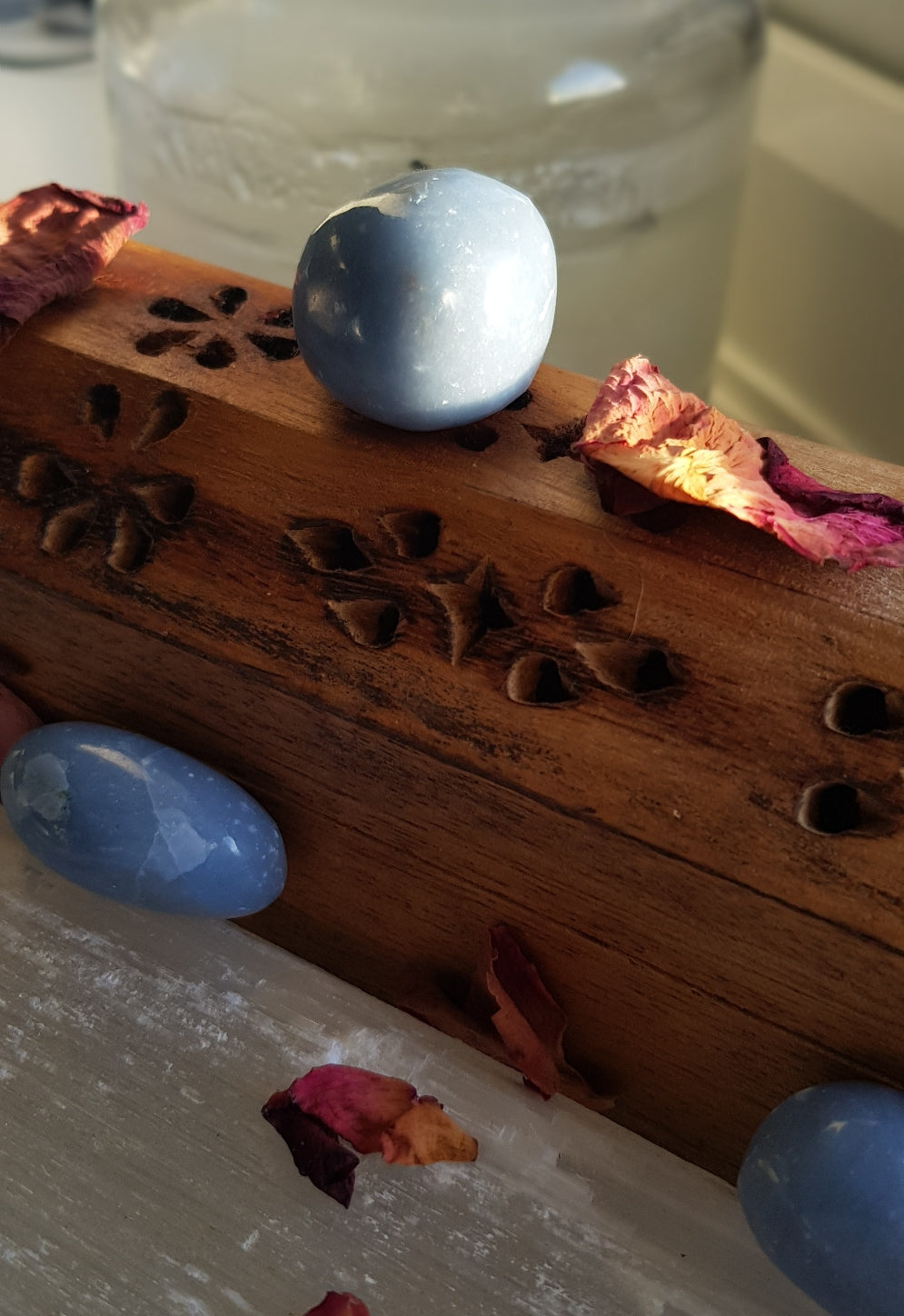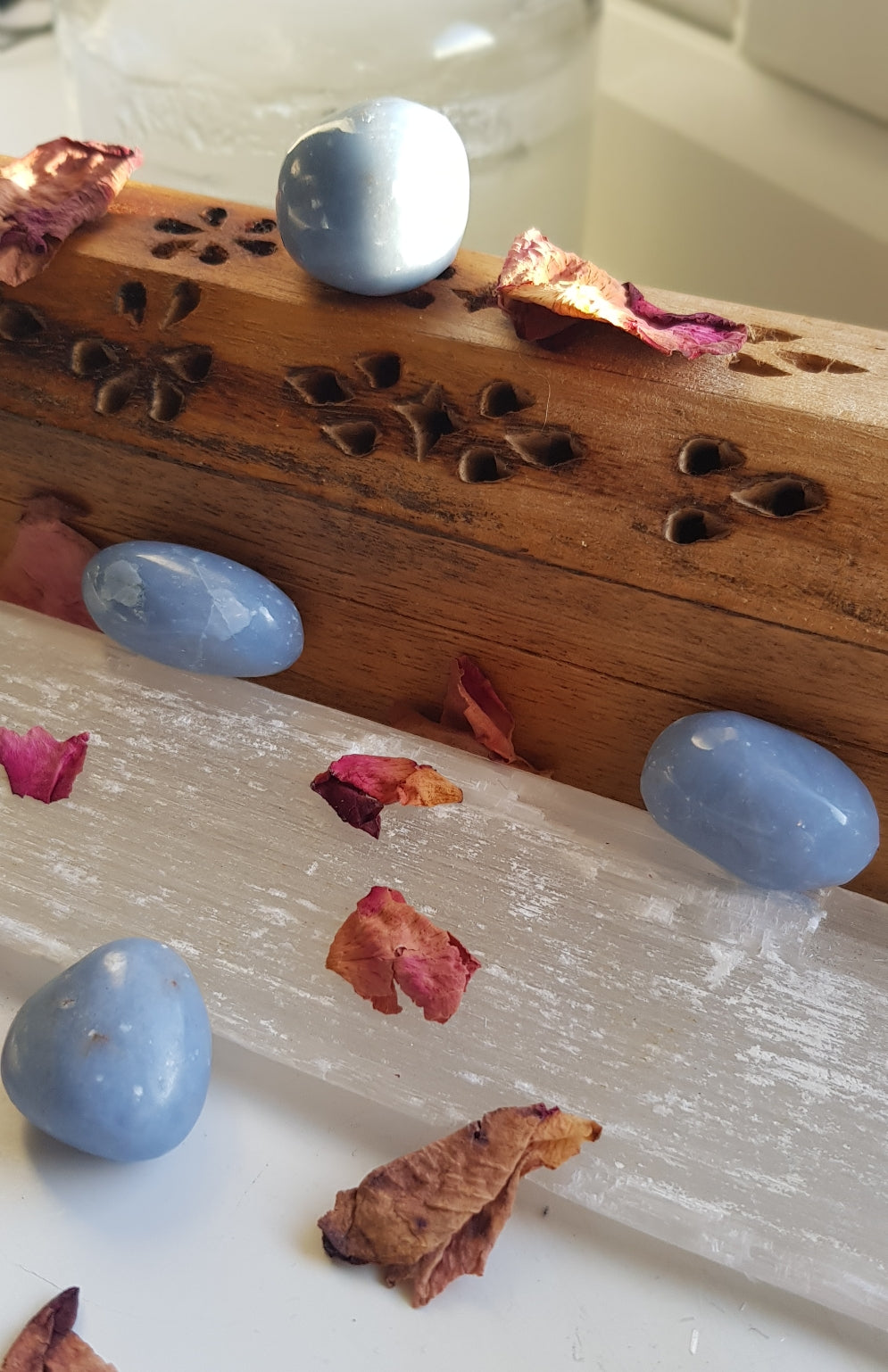 Angelite is a crystal of angelic energy. It helps connect us to our angels and the angelic realms as well as assisting with grief and brings peace to our hearts. It helps activate the Crown chakra.