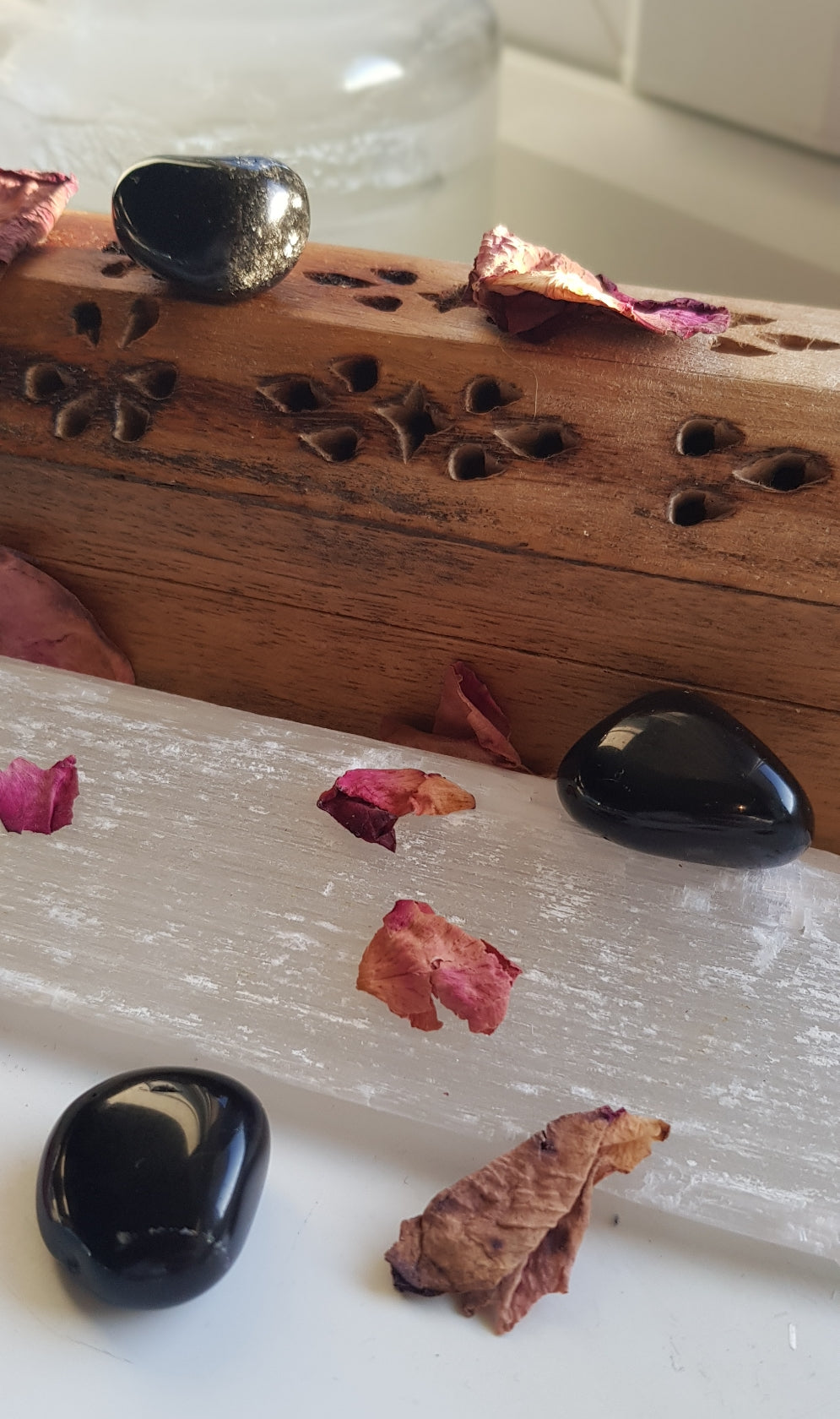Black Obsidian is a volcanic glass. Its great for negativity and helps with stress and anxiety. It helps you stay grounded and is used for protection.