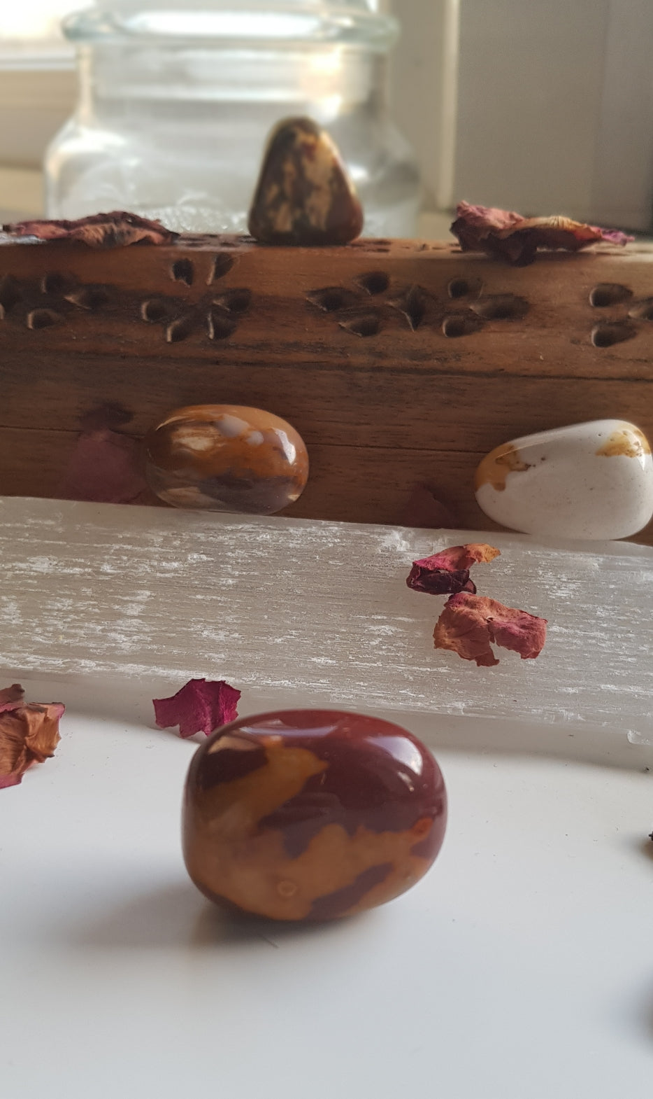 Mookaite is a type of Jasper. It helps keep us grounded and keep the Root Chakra balanced. It heals ancestral trauma. It is said to slow down the aging process and puts adventure and fun back into your heart.