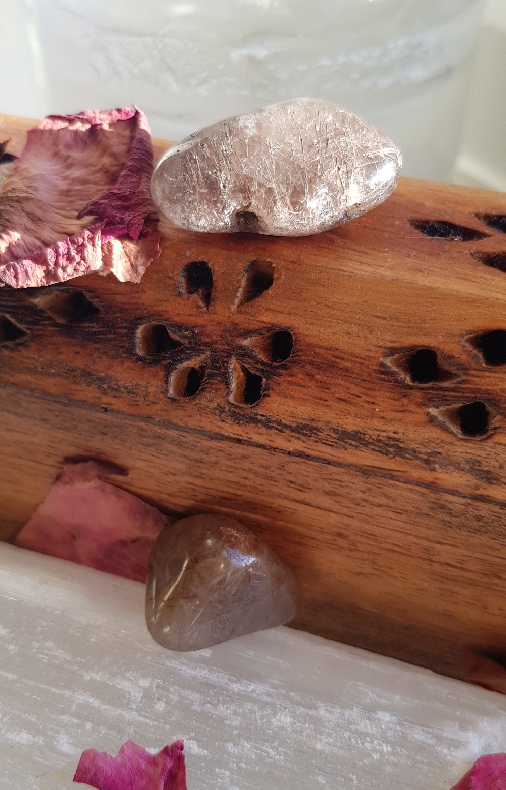 Rutilated Quartz is a quartz crystal that contains strands of golden rutile inside. Almost presenting a look of tinsel. The golden strands infuse the body, aura and chakras with light and love from the universe. It illuminates the soul , aiding spiritual growth. It heals damaged auras and cleanses the mind. Helps with manifesting and carries an angelic etheric energy. It promotes astral travel and channelling. Activates the crown chakra.